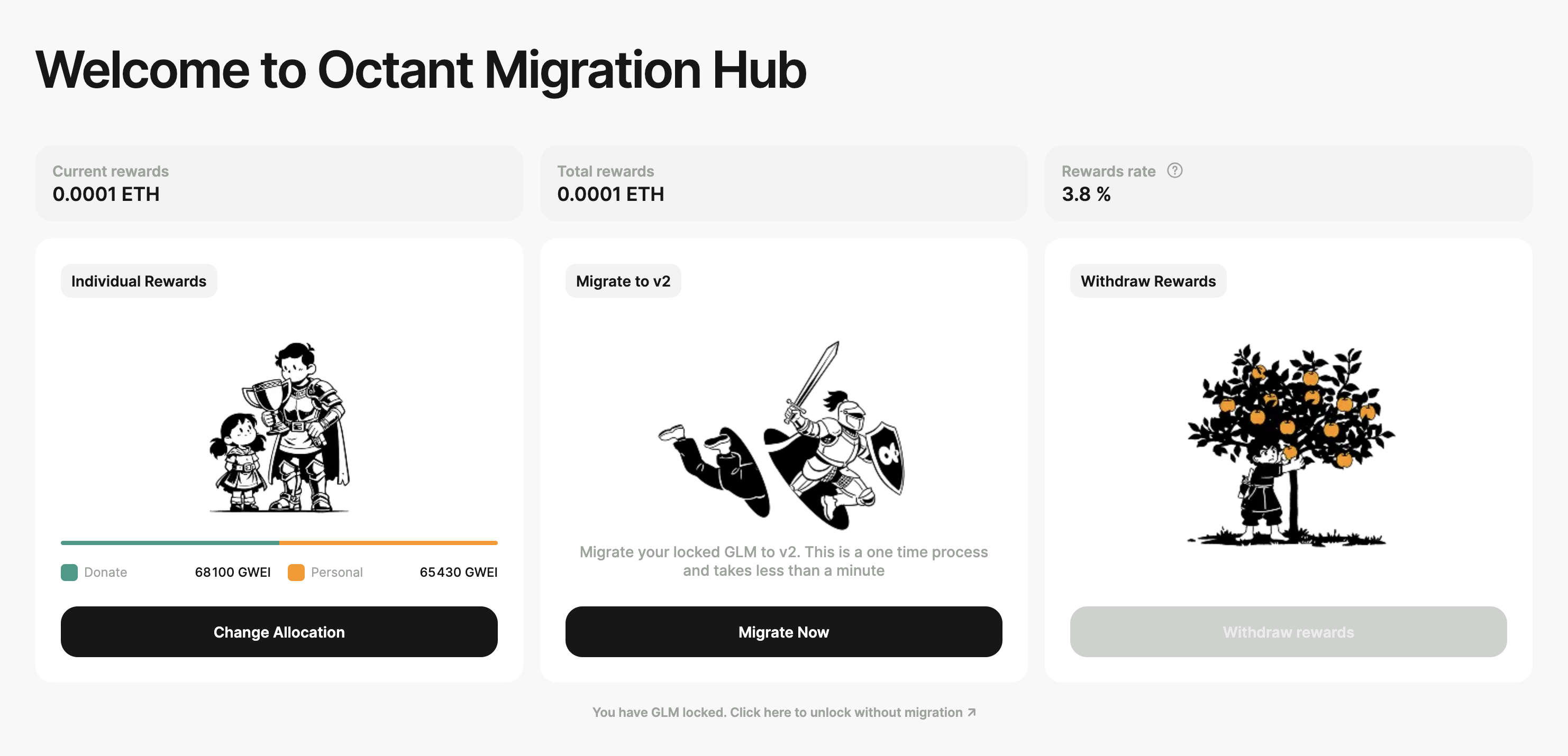Important: There will be no more allocation windows on Octant v1. If you do not migrate, you will stop earning Individual Rewards on your locked GLM and cannot participate in future fund distributions.