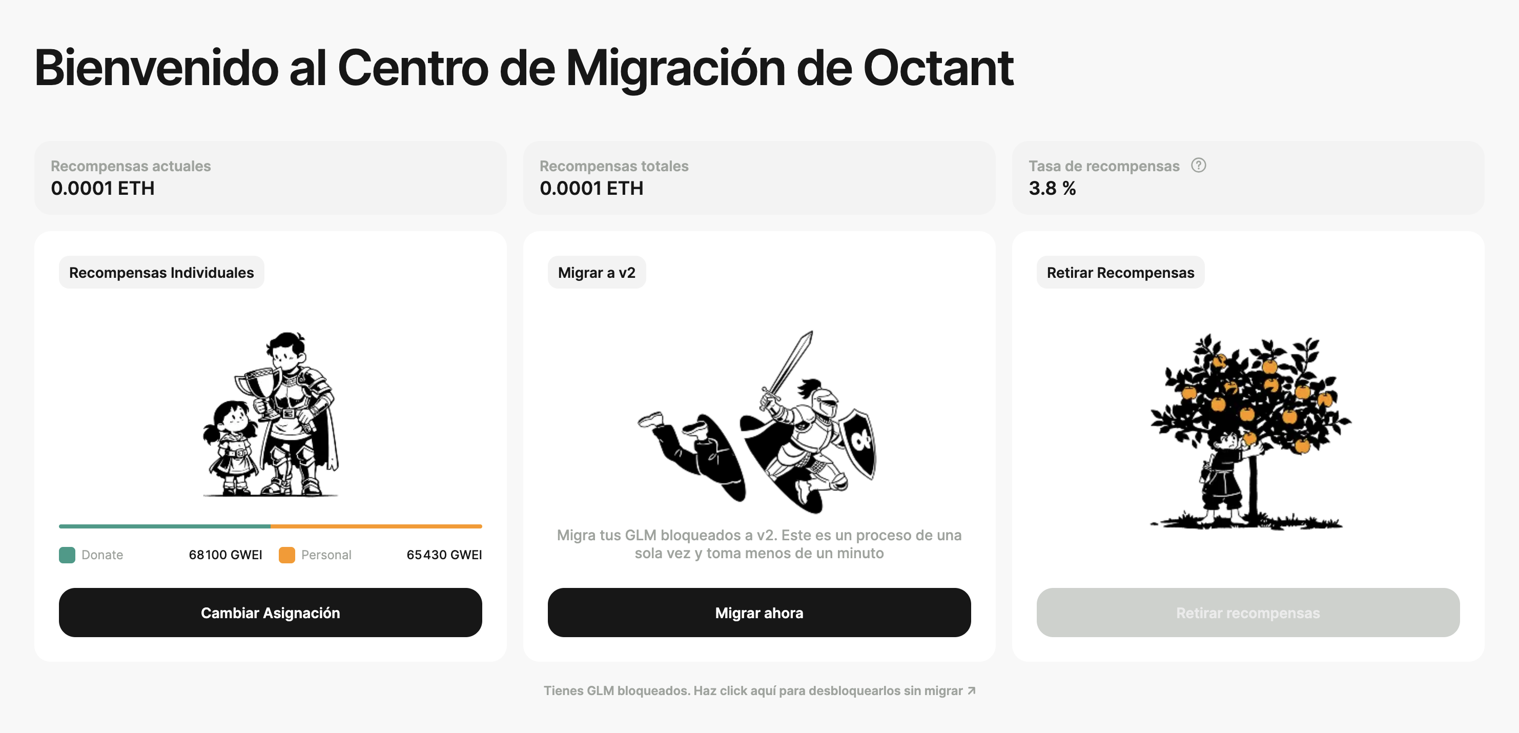 - Solicitud de migración: Se te pedirá que migres tus GLMs bloqueado desde la app v1 a la app Octant v2.